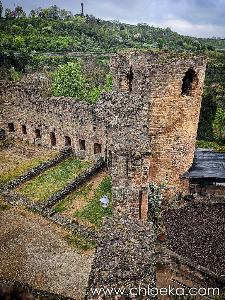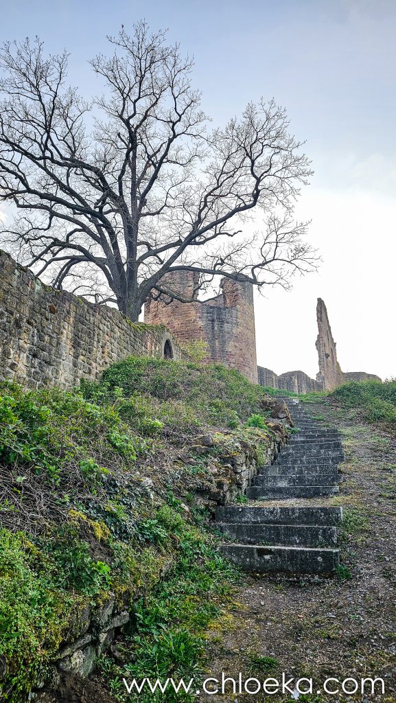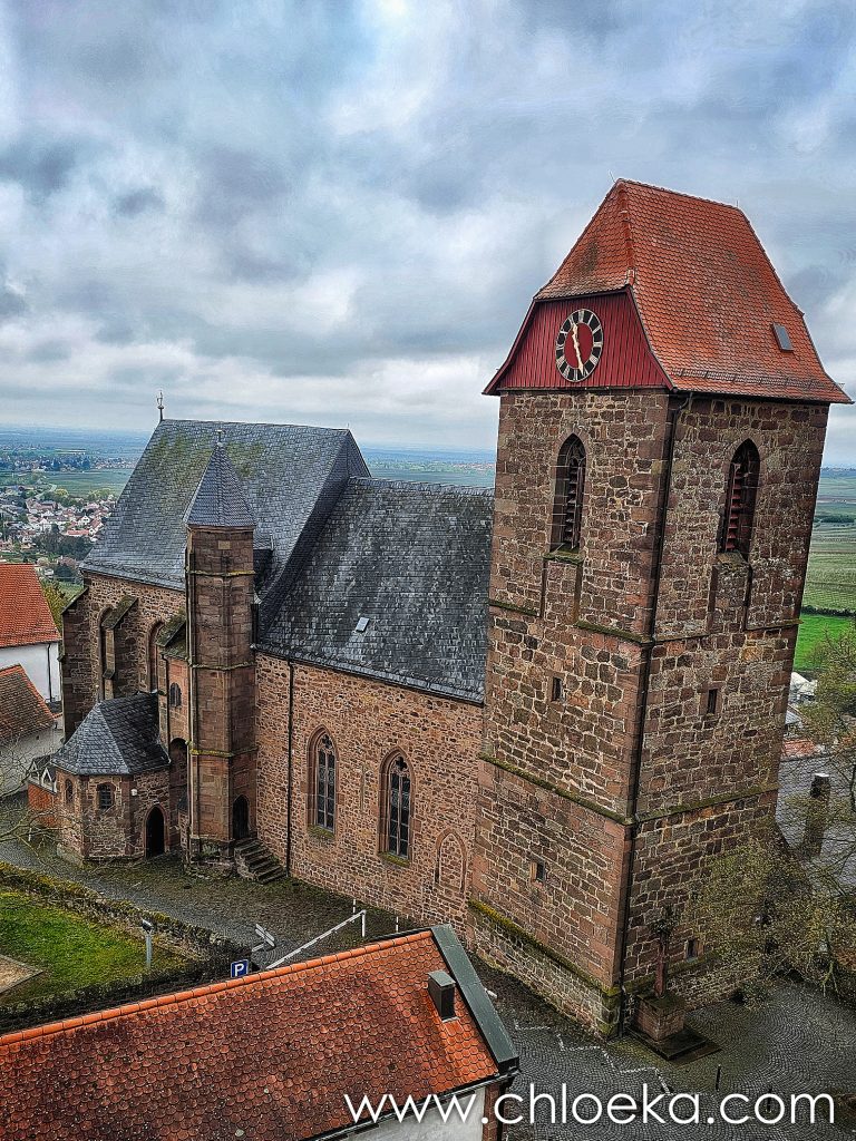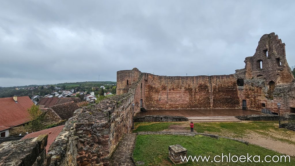 Première étape, perchée à près de 270 m d’altitude, la ruine du château de Neuleiningen qui surplombe le village et la vallée de l’Eckbach, à la frontière entre la forêt du Palatinat et les reliefs tertiaires. Construite vers 1240 par le comte Frédéric III de Leiningen-Dagsburg, elle faisait partie d’un réseau défensif avec Altleiningen et Battenberg, contrôlant l’accès depuis la plaine du Rhin.