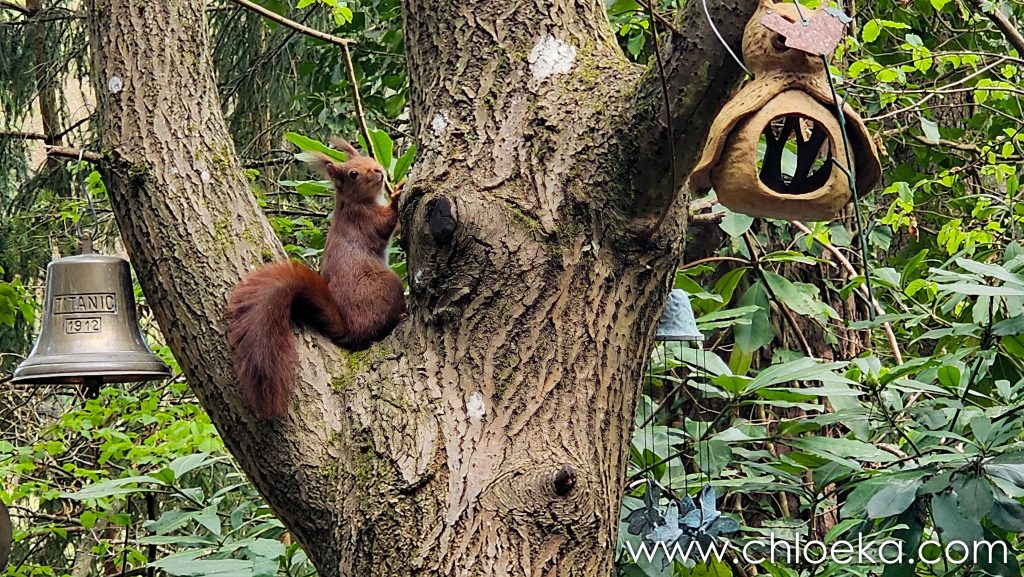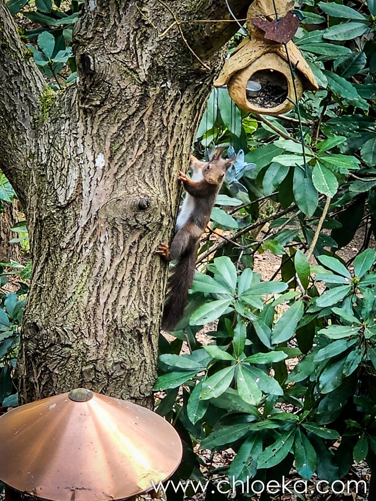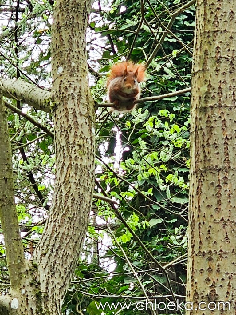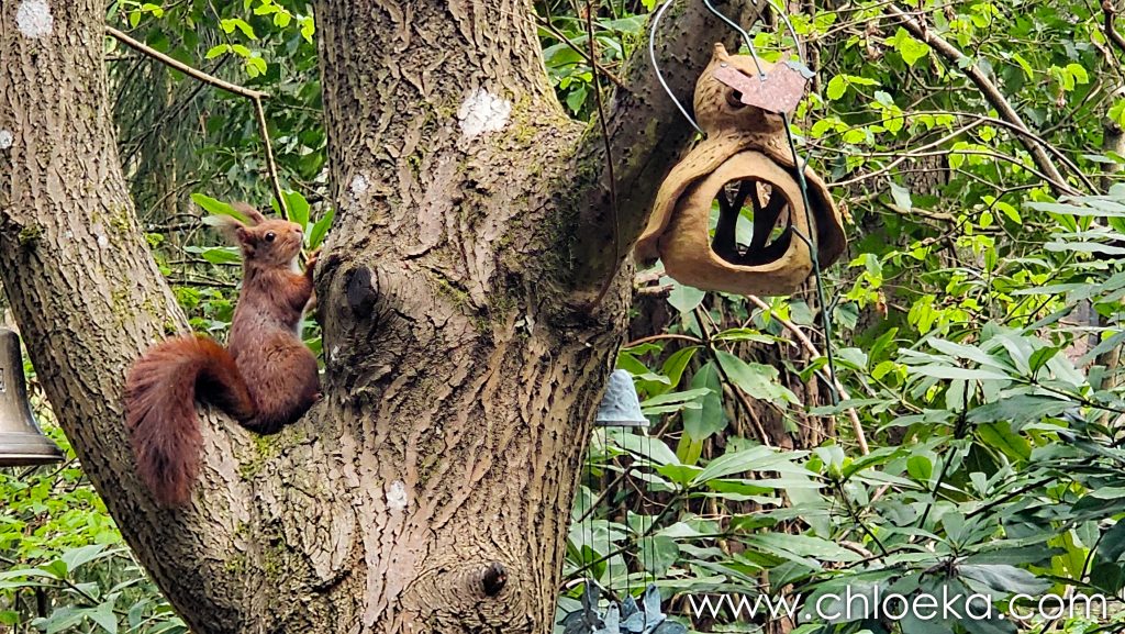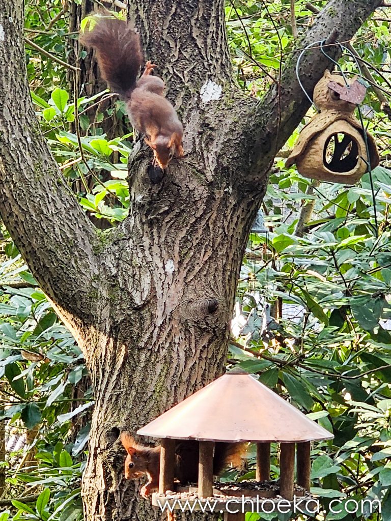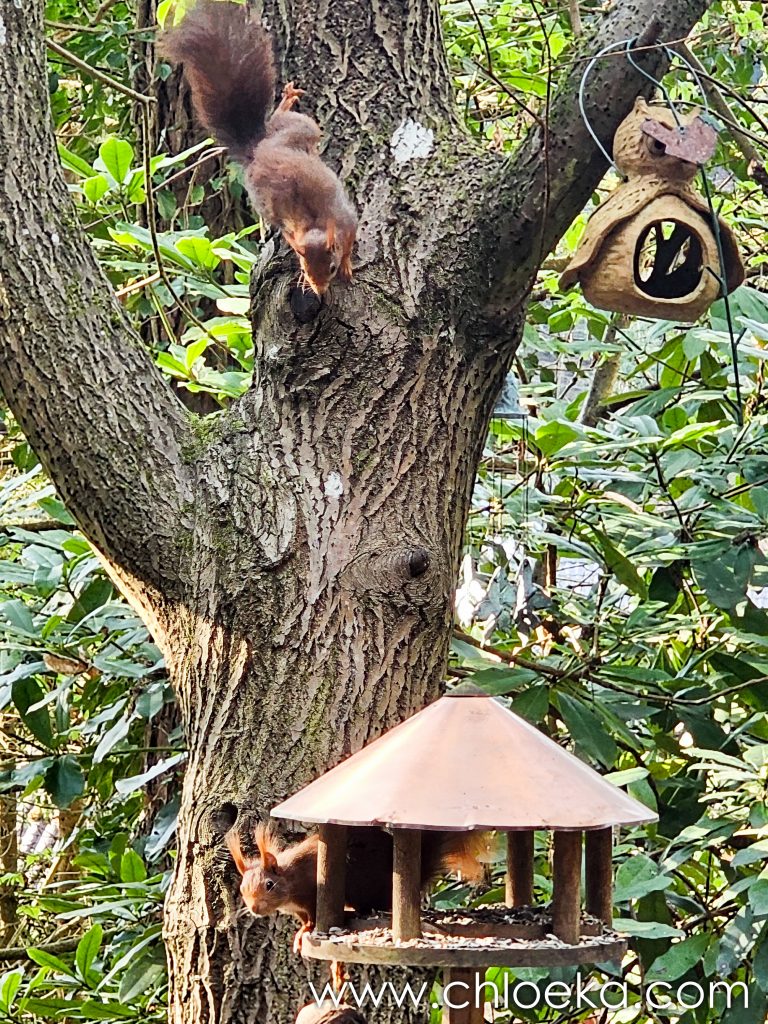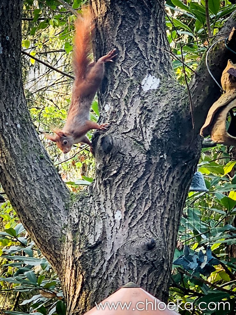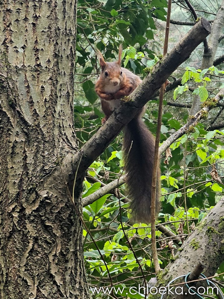 Sinon, nous avons officiellement trois écureuils ! La résidente “officielle” s’est installée entre deux branches, juste au-dessus de la mangeoire, en véritable gardienne du trésor. Les deux autres tentent des approches pas toujours discrètes… sans grand succès. Résultat : un va-et-vient complètement chaotique sur toutes les branches du coin.