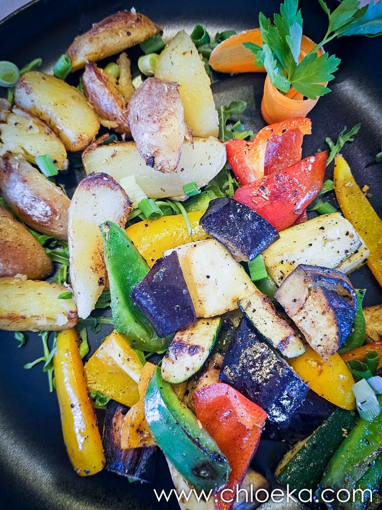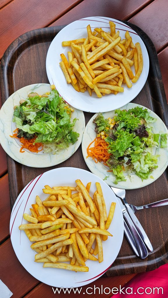 Au retour, on savoure pleinement notre plat de frites — délicieuses — accompagné de salades composées. Installées dehors, sur les tables et chaises en bois du Rahnenhof, le moment est simple et parfaitement appréciable.