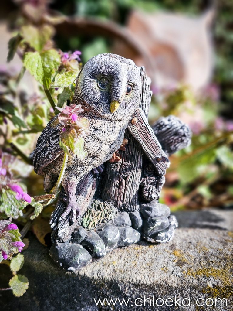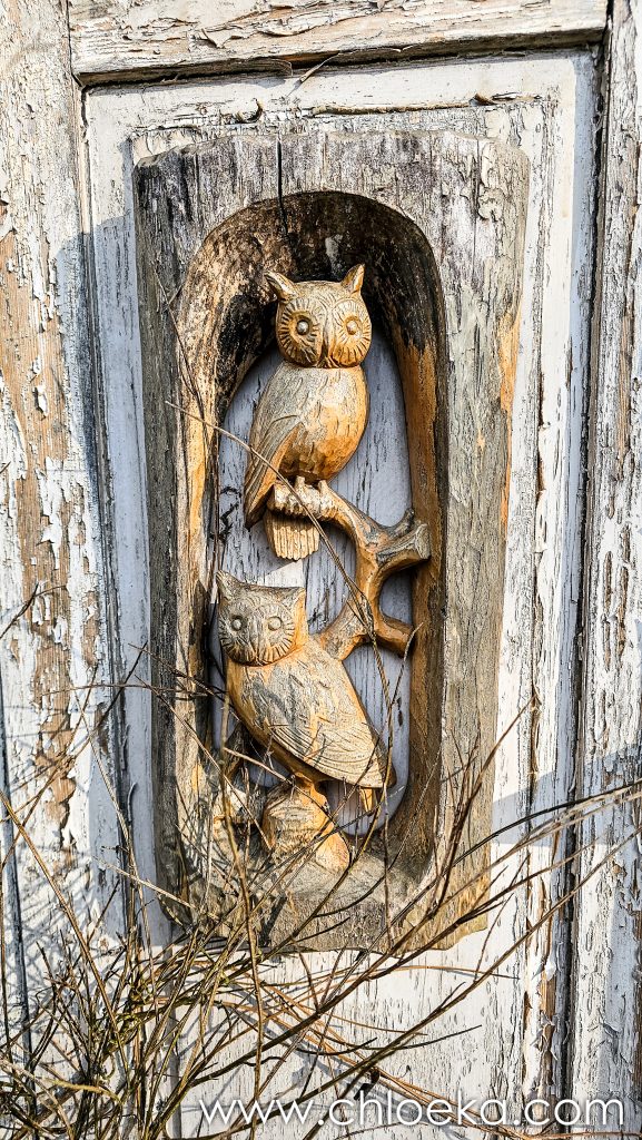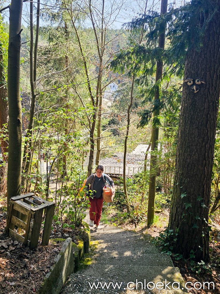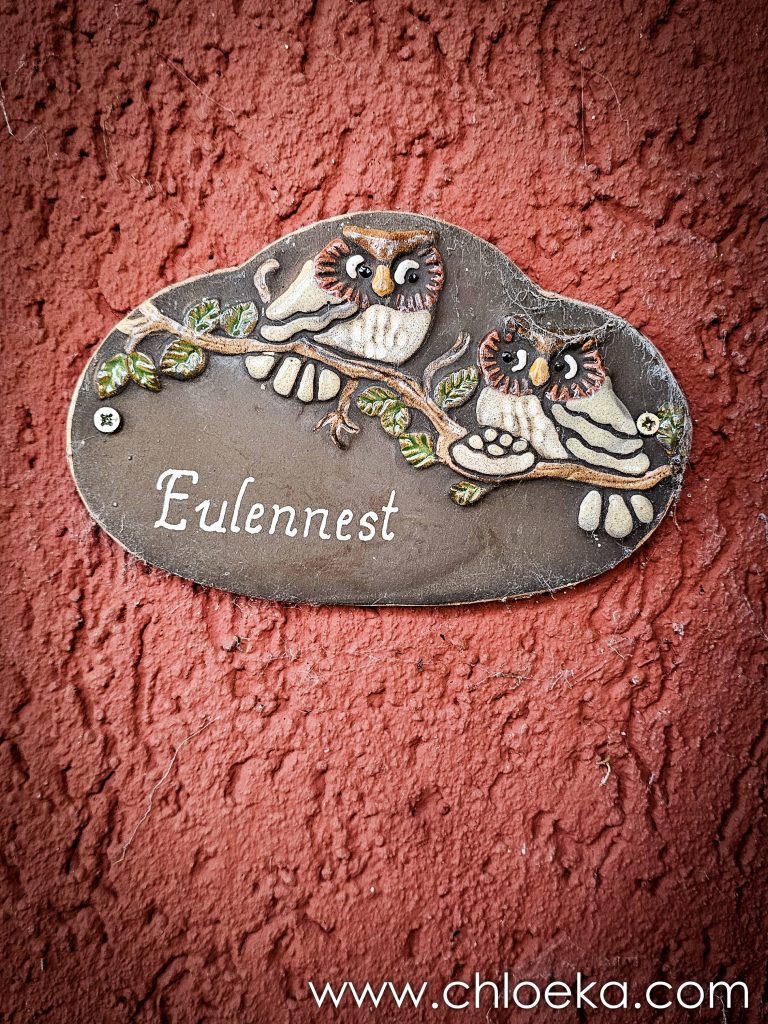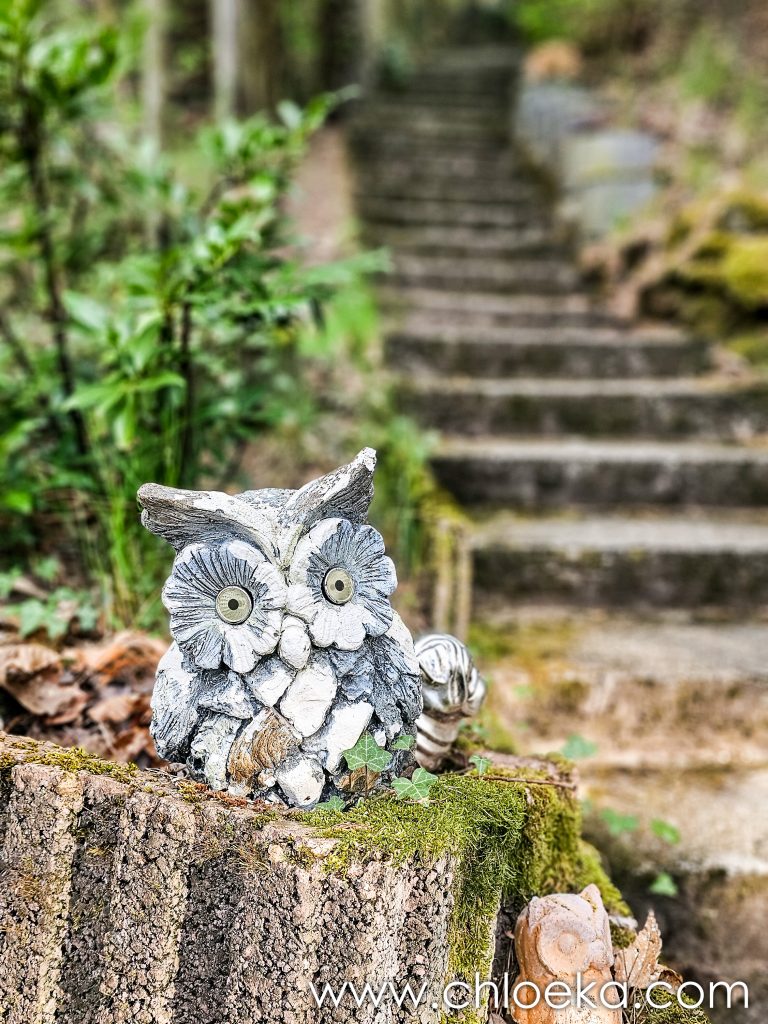 Notre gîte est incroyable. C’est une maison nichée dans une pente abrupte à l’orée de la forêt. Son nom : « le nid de la chouette ». Il y a des bibelots de toute sorte qui jalonnent l’immense jardin et qui nous rappelle que nous sommes, effectivement, dans le nid de la chouette. La déco fait un peu bric à brac mais n’est pas dénuée de charme. La maison a tout le confort possible. Le lieu est très calme, habité par une multitude d’oiseaux : merle, pouillot véloce, rouge gorge, roitelet triple-bandeau, …