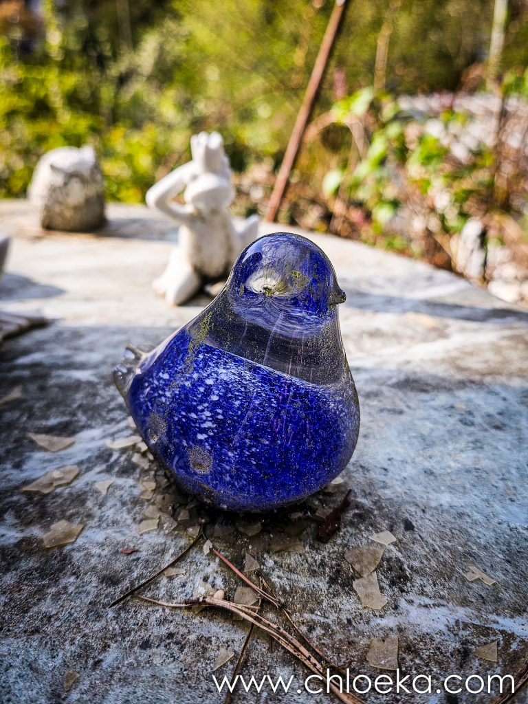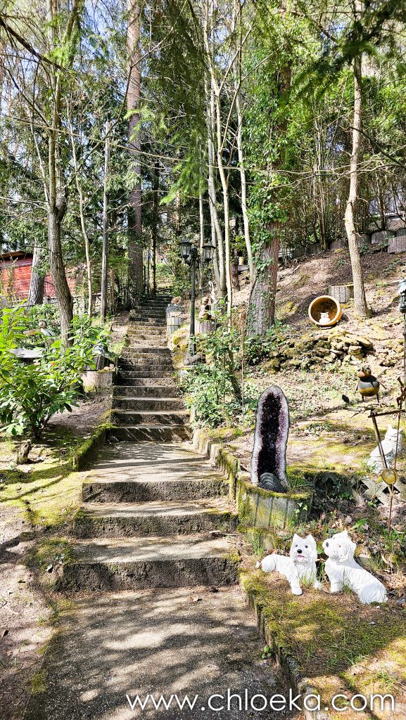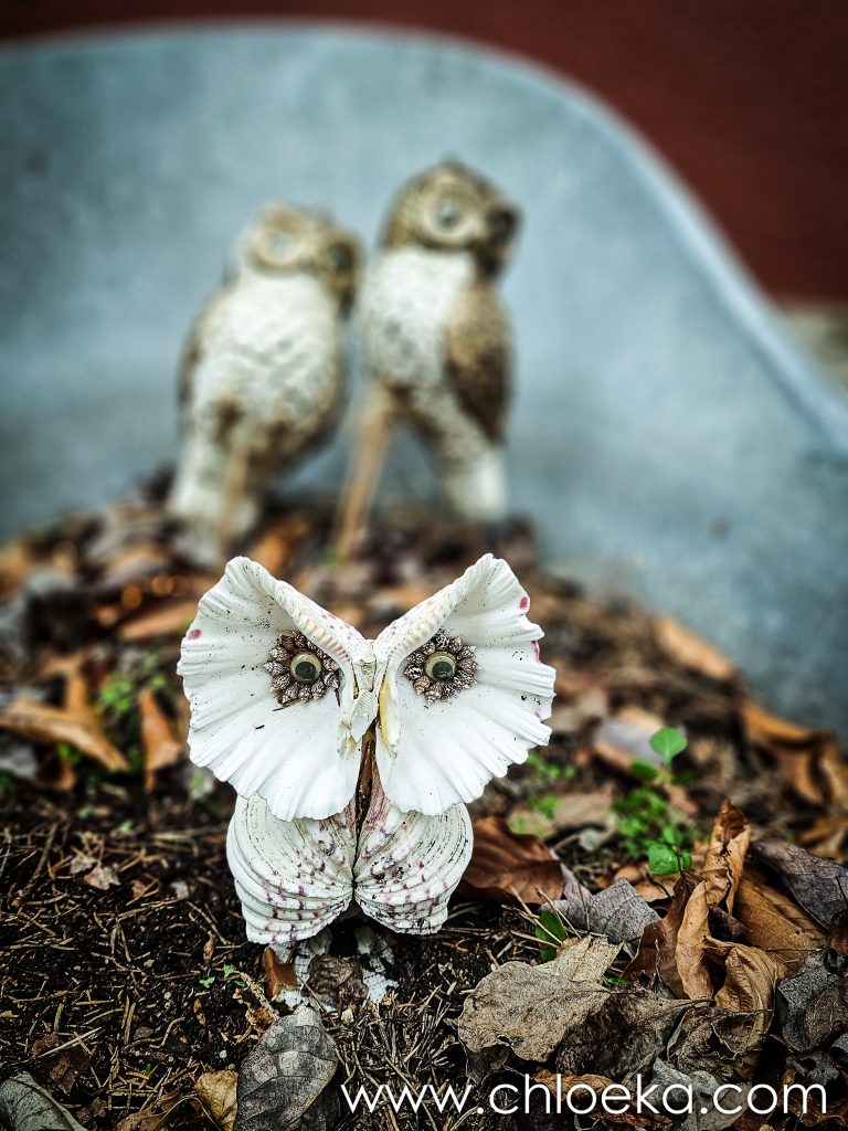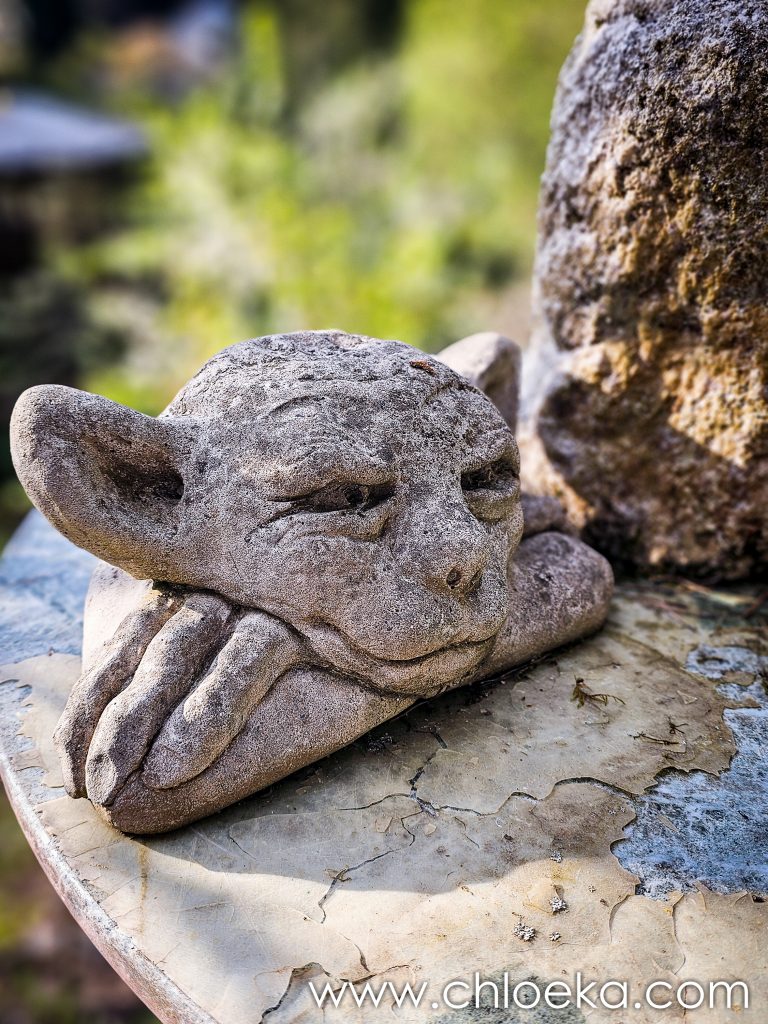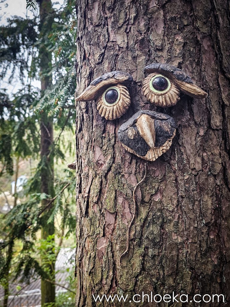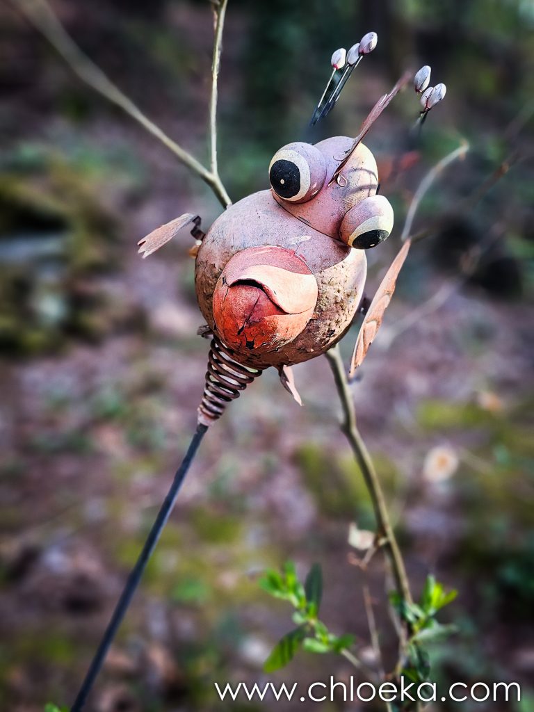 Notre gîte est incroyable. C’est une maison nichée dans une pente abrupte à l’orée de la forêt. Son nom : « le nid de la chouette ». Il y a des bibelots de toute sorte qui jalonnent l’immense jardin et qui nous rappelle que nous sommes, effectivement, dans le nid de la chouette. La déco fait un peu bric à brac mais n’est pas dénuée de charme. La maison a tout le confort possible. Le lieu est très calme, habité par une multitude d’oiseaux : merle, pouillot véloce, rouge gorge, roitelet triple-bandeau, …