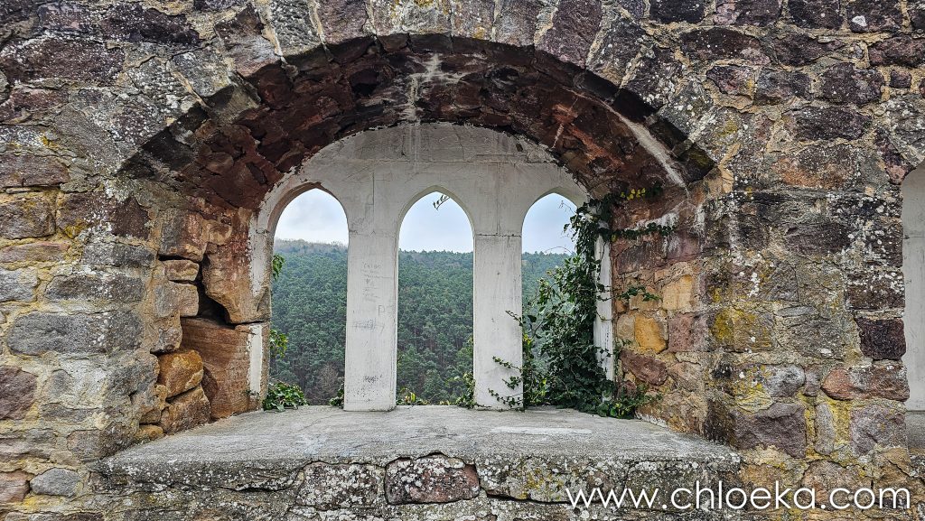 Troisième et dernière étape, le hameau de Höningen, niché à environ 300 mètres d’altitude au bord de la forêt du Palatinat, le paysage se resserre, plus intime, plus rural, presque secret. Une route étroite serpente entre les collines vers le Rahnfels et nous y conduit. Le cœur du lieu, ce sont les vestiges du monastère augustinien fondé au XIIe siècle : des pans de murs, un pignon d’église encore debout, un porche qui semble ouvrir sur un autre temps.