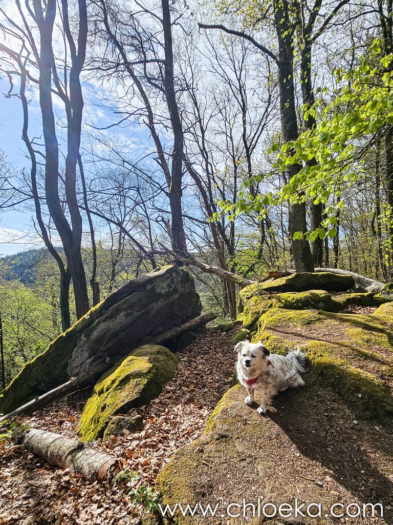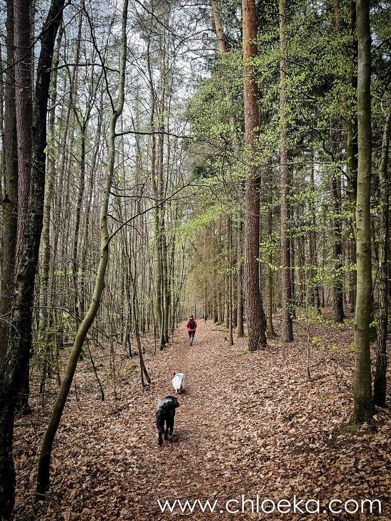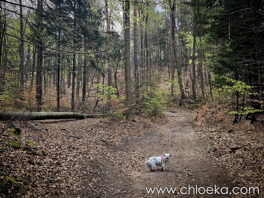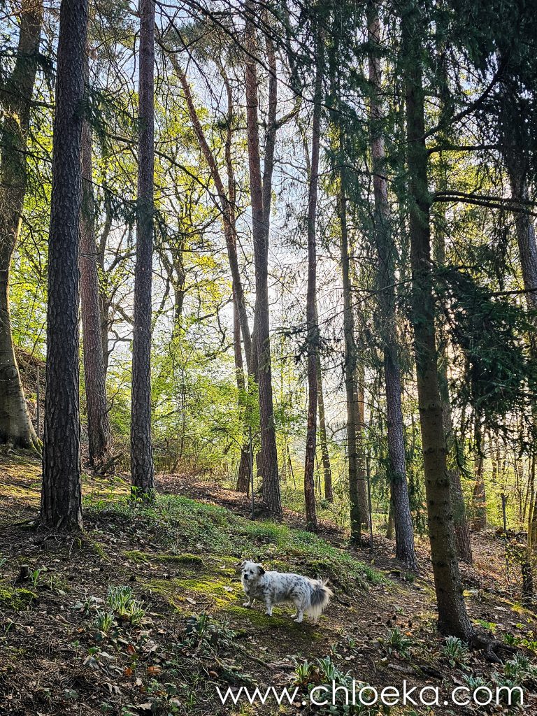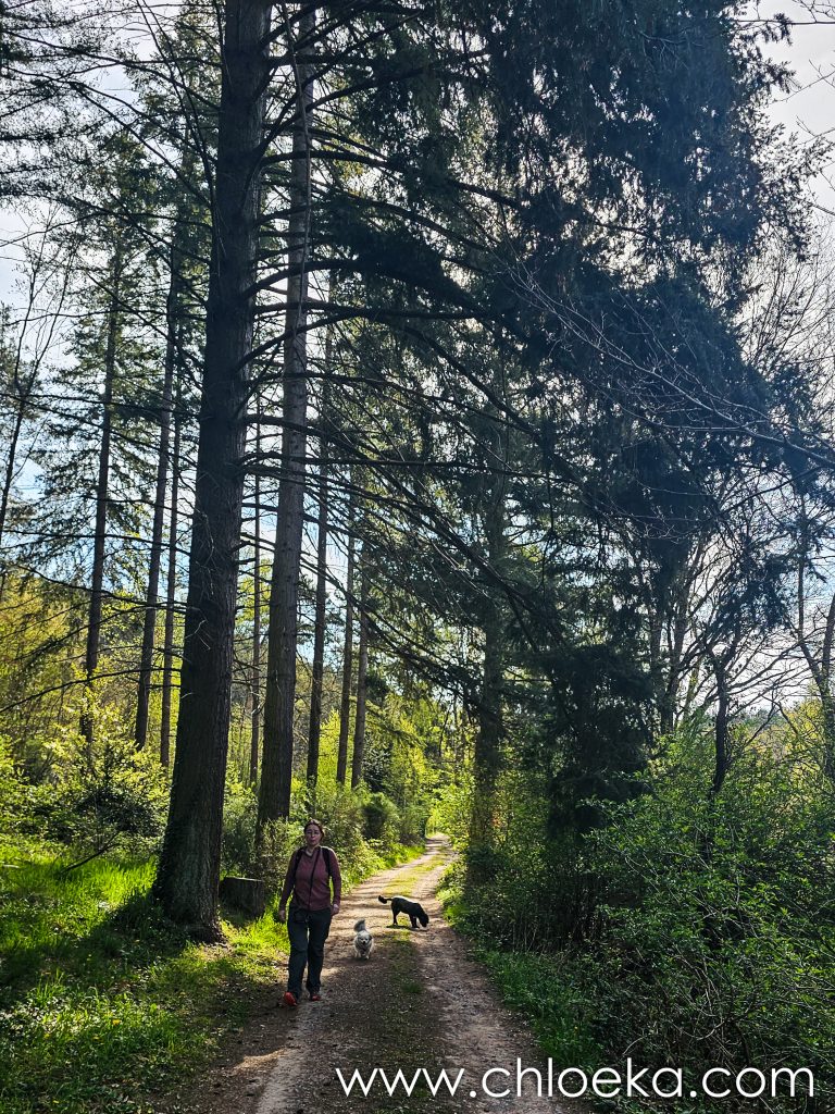 Un château domine le village, aujourd’hui transformé en hôtel privé. Alors nous avons préféré arpenter les forêts alentours, verdoyantes, sur une dizaine de kilomètres — notre première vraie journée printanière : les feuillus déploient leurs jeunes feuilles, et les oiseaux s’en donnent à cœur joie dans une joyeuse cacophonie de saison. Toujours très peu d’humains sur les circuits empruntés (très bien balisés par ailleurs).  On privilégie des petits circuits pour Suzy — 9 ans, de l’arthrose — mais toujours partante pour randonner. Comme elle adore cela, j’adapte nos découvertes à ses capacités.