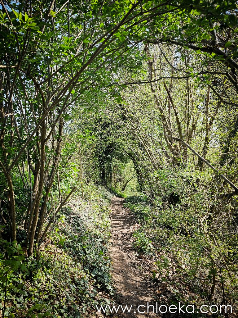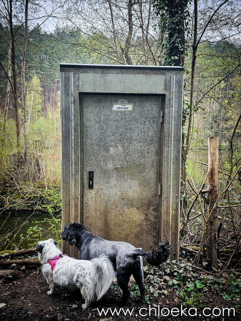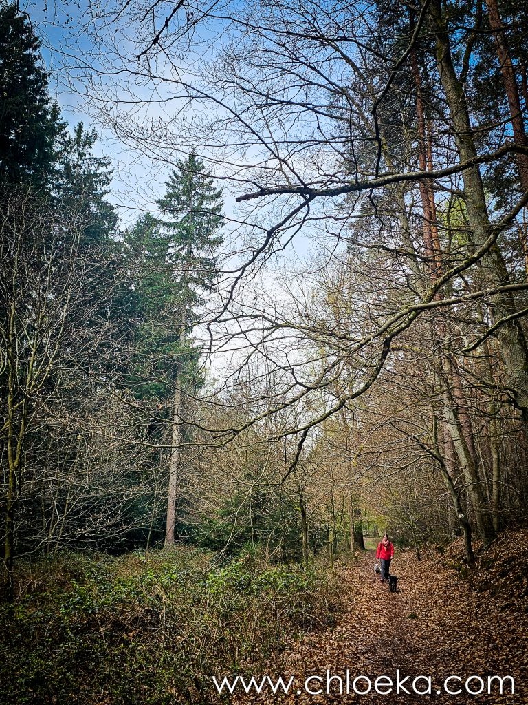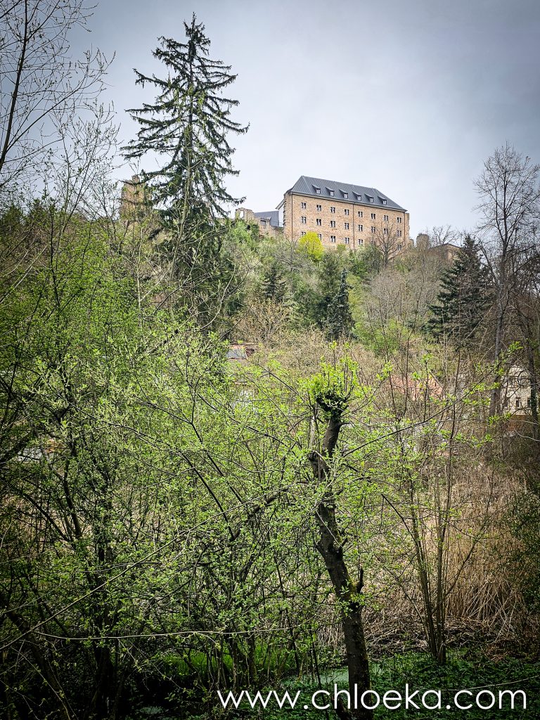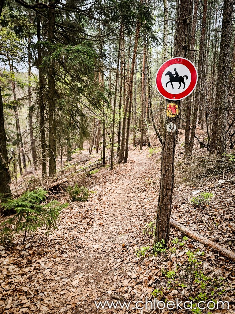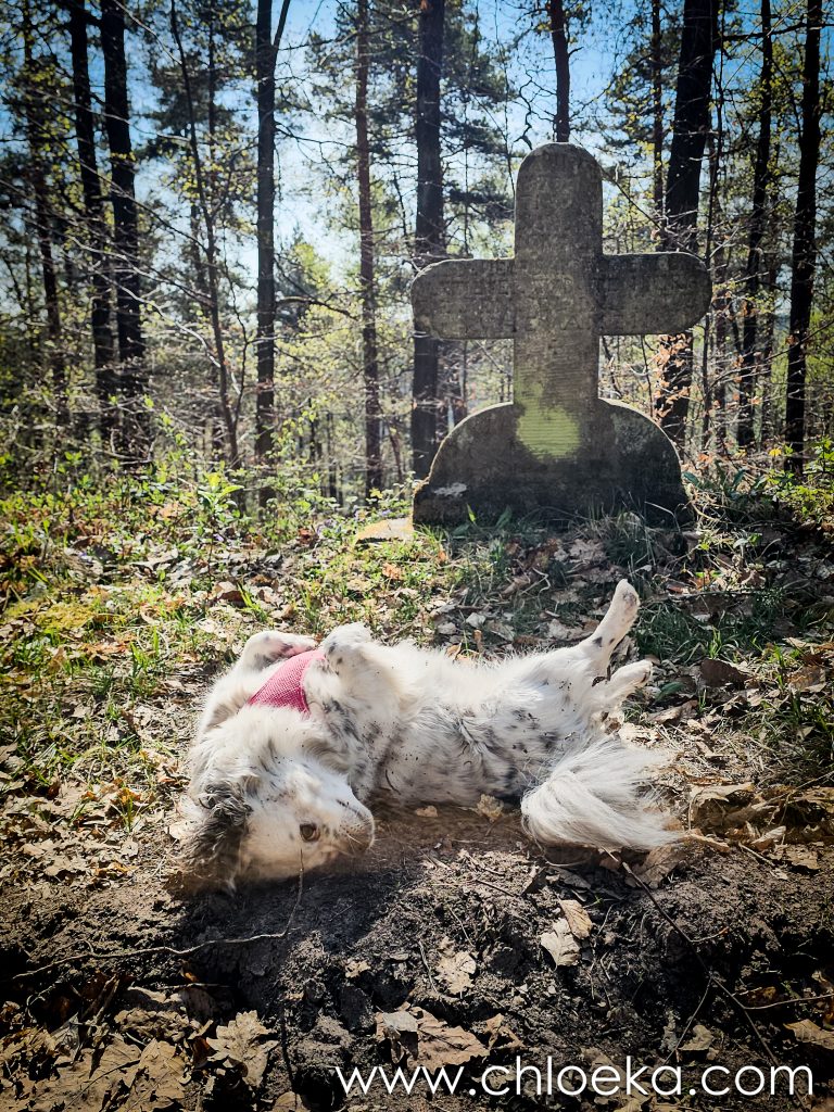 Un château domine le village, aujourd’hui transformé en hôtel privé. Alors nous avons préféré arpenter les forêts alentours, verdoyantes, sur une dizaine de kilomètres — notre première vraie journée printanière : les feuillus déploient leurs jeunes feuilles, et les oiseaux s’en donnent à cœur joie dans une joyeuse cacophonie de saison. Toujours très peu d’humains sur les circuits empruntés (très bien balisés par ailleurs).  On privilégie des petits circuits pour Suzy — 9 ans, de l’arthrose — mais toujours partante pour randonner. Comme elle adore cela, j’adapte nos découvertes à ses capacités.