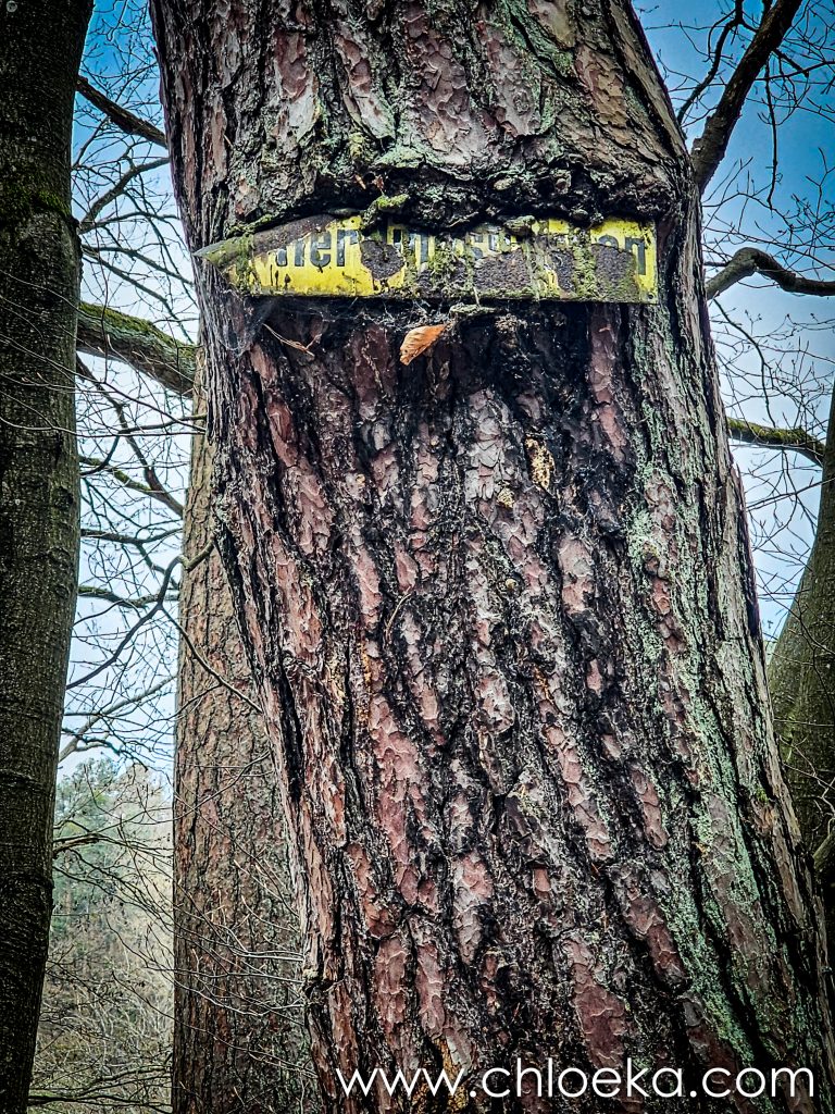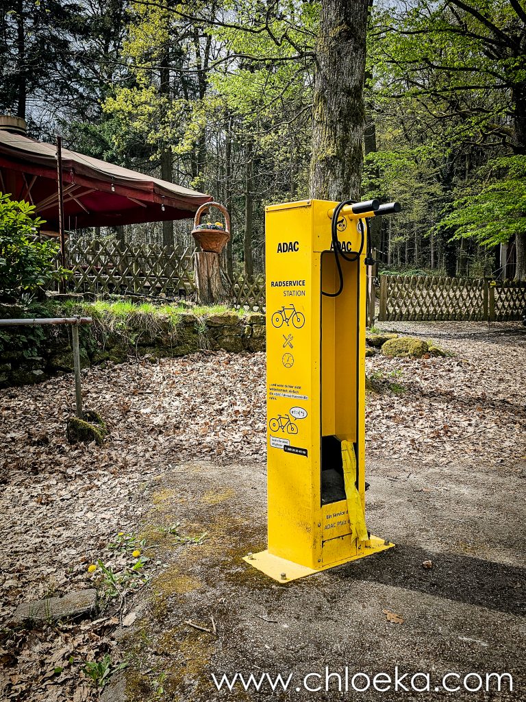 Le sentier continue, croise la Lindemannsruhe, ancienne maison forestière née dans les années 1920, témoin discret d’une époque où l’on organisait la forêt autrement.  Au pied de cette maison forestière, une borne jaune tranche avec les teintes du sous-bois. Station de secours pour vélos : outils suspendus, pompe prête à l’usage. Un petit îlot d’assistance au milieu du chemin.