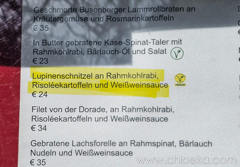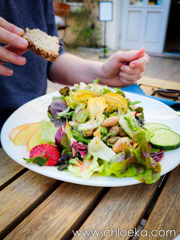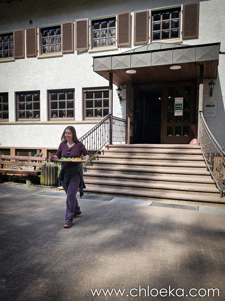 Nous rentrons, affamées, et décidons d’aller déjeuner dans la maison de la nature « Rahnenhof » à 500m de notre gîte. Nous l’avons repérée sur Happy Cow car elle propose deux plats véganes.