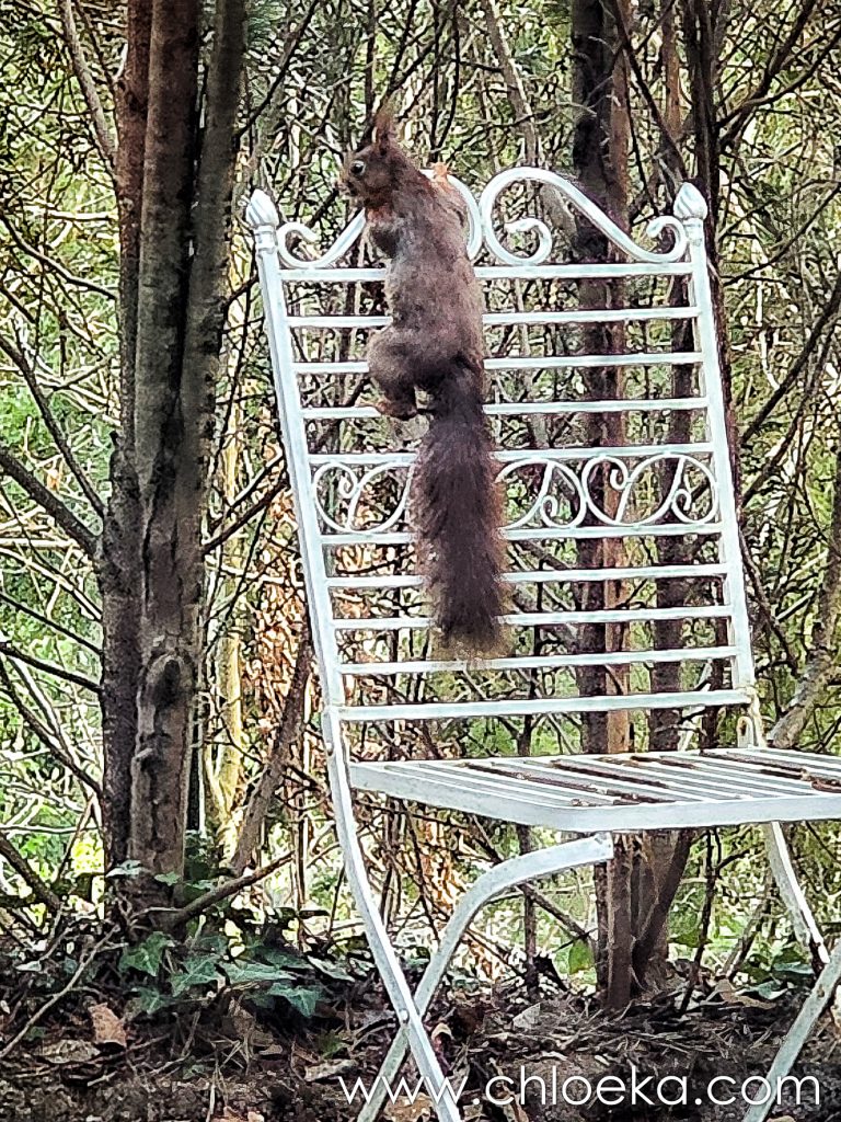 Je me suis installée devant la fenêtre de la cuisine, tournée vers la mangeoire du jardin. Pendant que j’écris, Miss Écureuil apparaît, repart, puis revient encore se nourrir de quelques graines, pour mon plus grand plaisir.