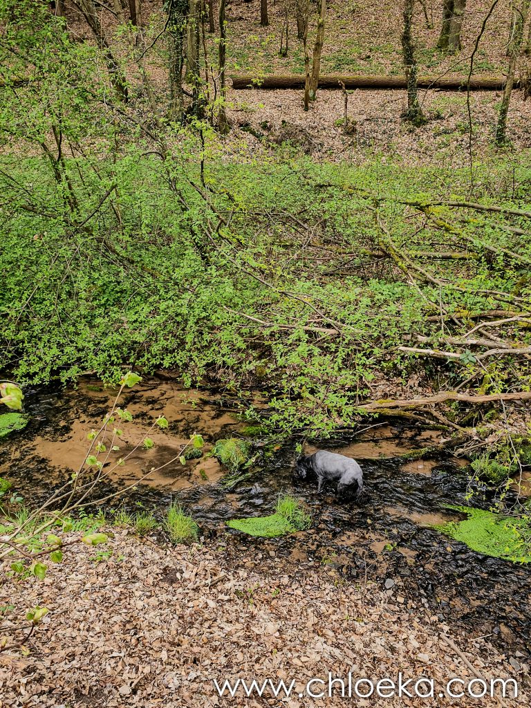 La lumière est plus diffuse, les sons s’étouffent. Les rochers disparaissent, mais leur présence reste en mémoire, comme une ponctuation dans la marche. Le retour se fait par un sentier étroit à flanc de montagne puis longe le ruisseau de l’Eckbach où Suzy va pouvoir se désaltérer.
