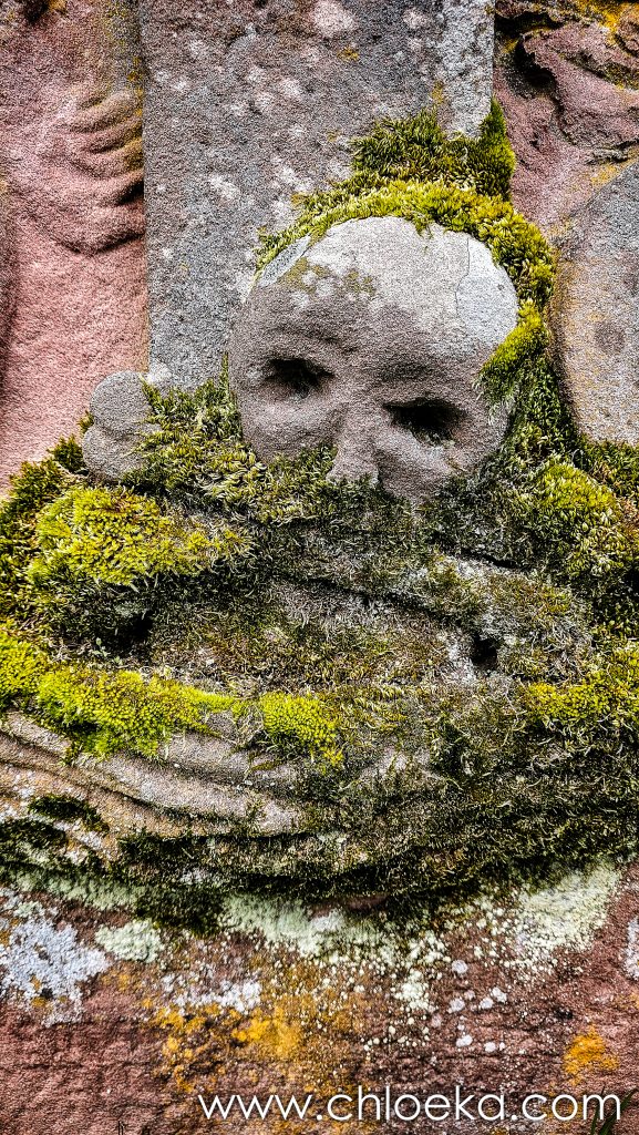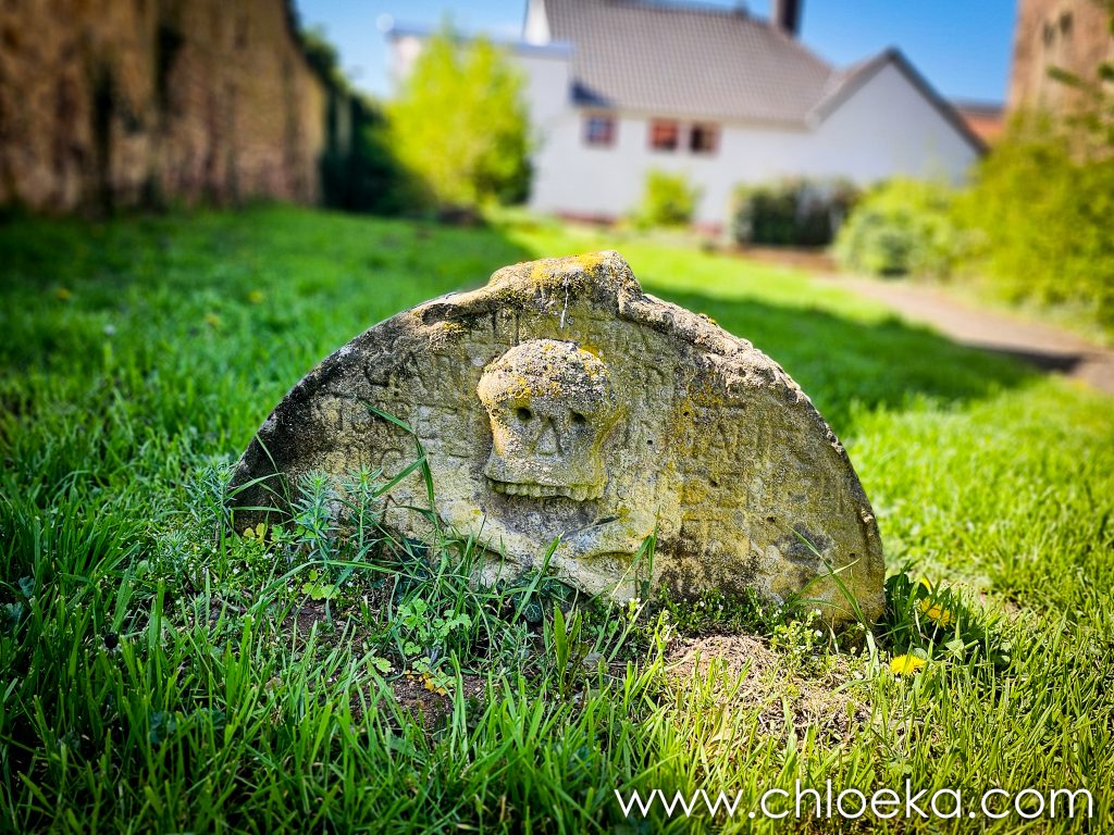 Autour d’elle, le cimetière s’étend en pente douce : des tombes clairsemées dans l’herbe humide, d’autres directement enchâssées dans le mur, presque absorbées par lui. Les plus anciennes, sculptées et rongées par le temps, côtoient des pierres plus récentes — sans rupture, comme si les époques cohabitaient harmonieusement.