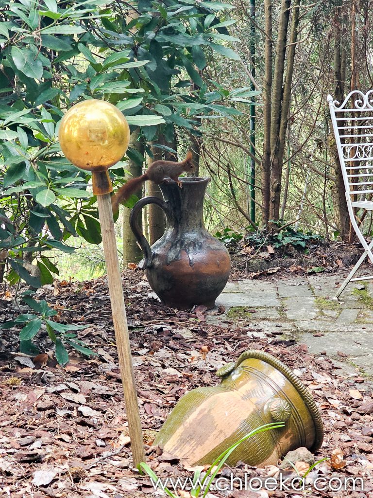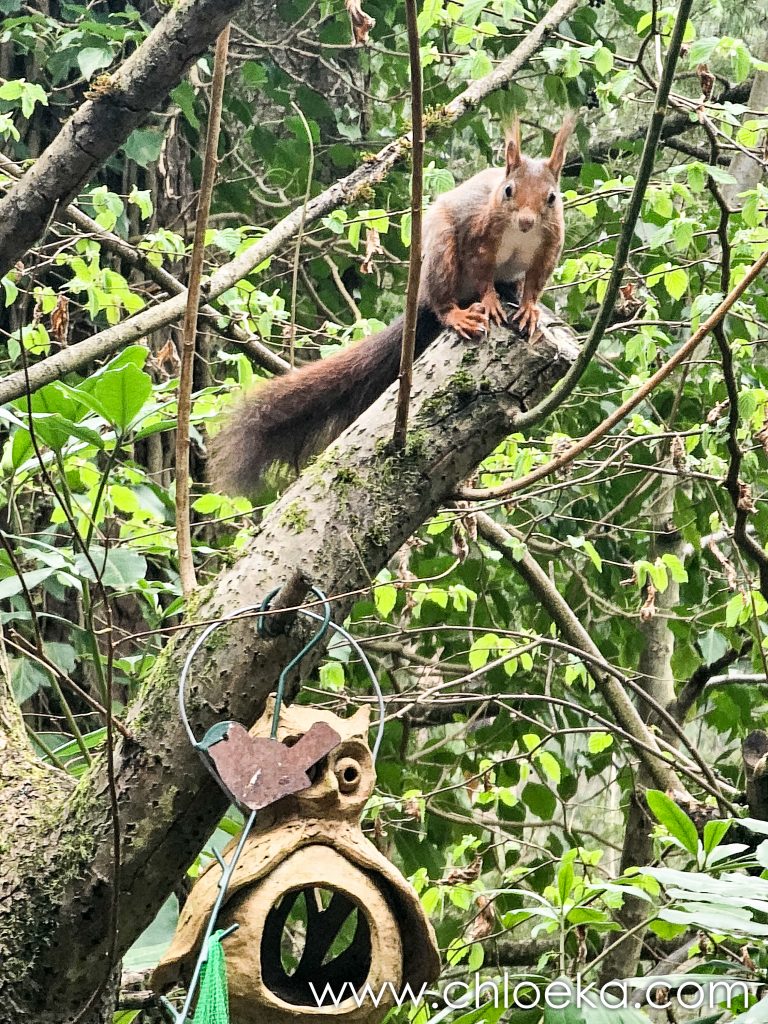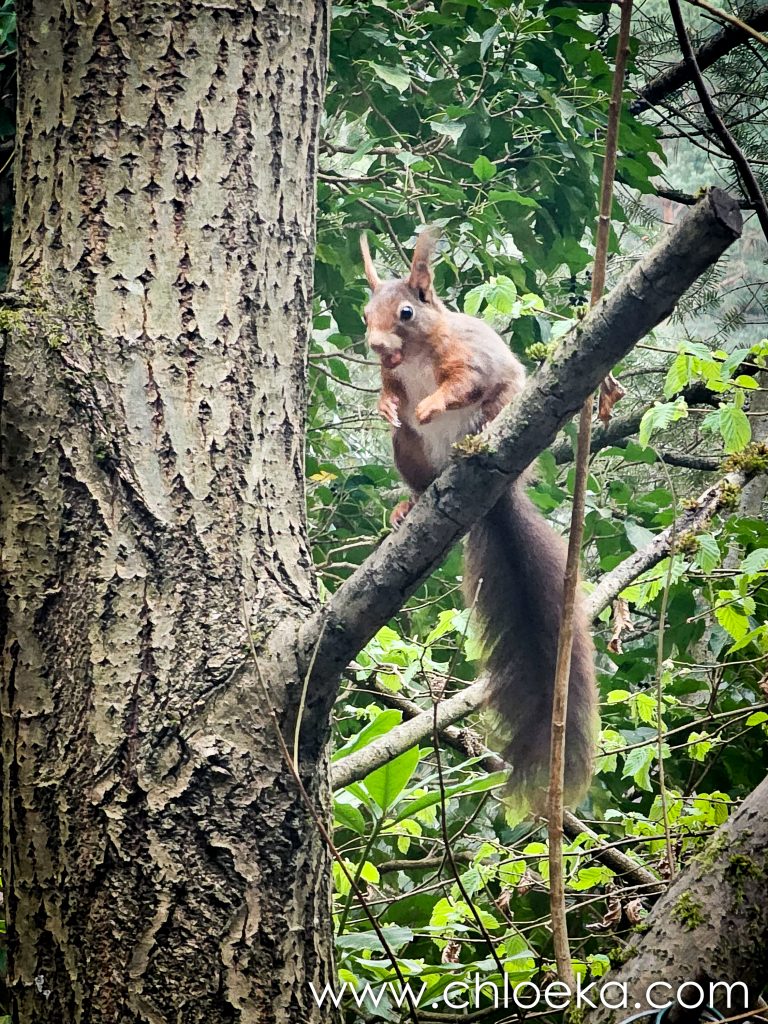 Phlau rentre en voiture avec les chiennes, je prends le petit sentier à travers bois pour rejoindre le gîte. L’après-midi sera occupée à observer la danse virevoltante de nos écureuils résident-es.