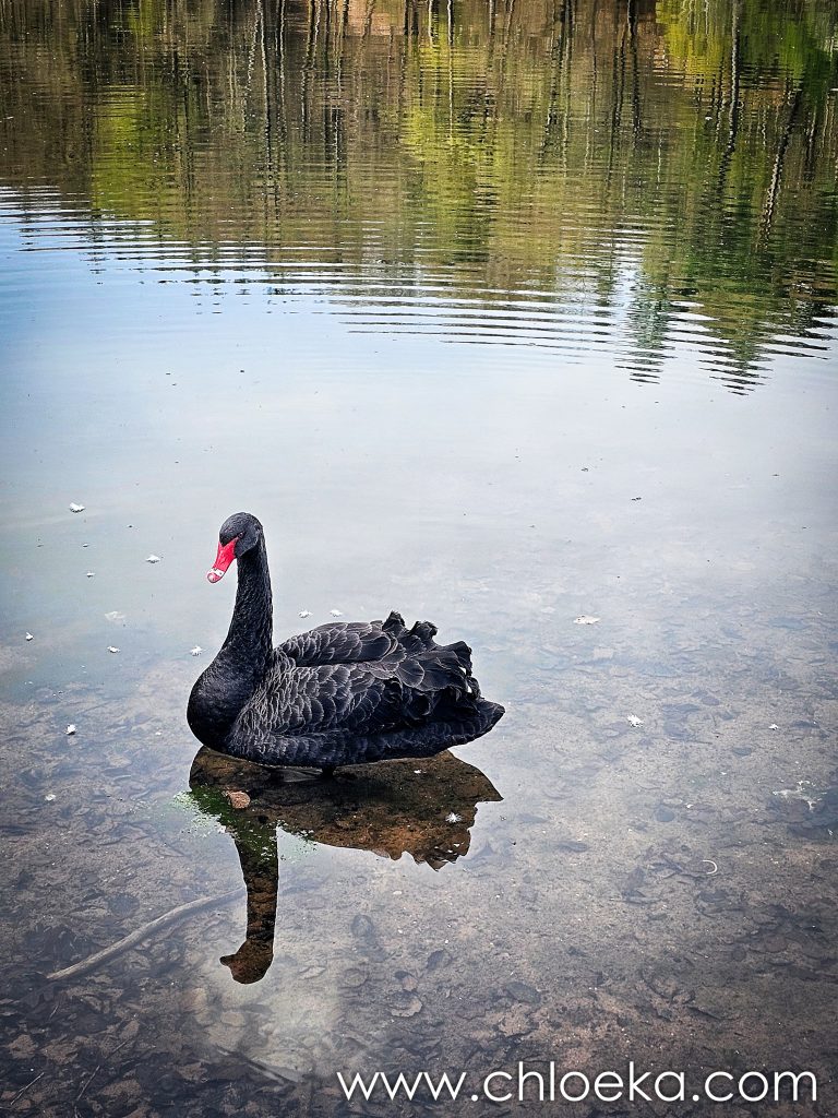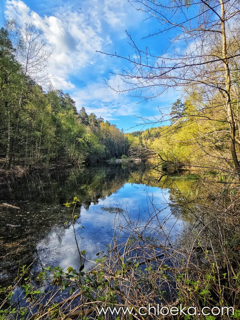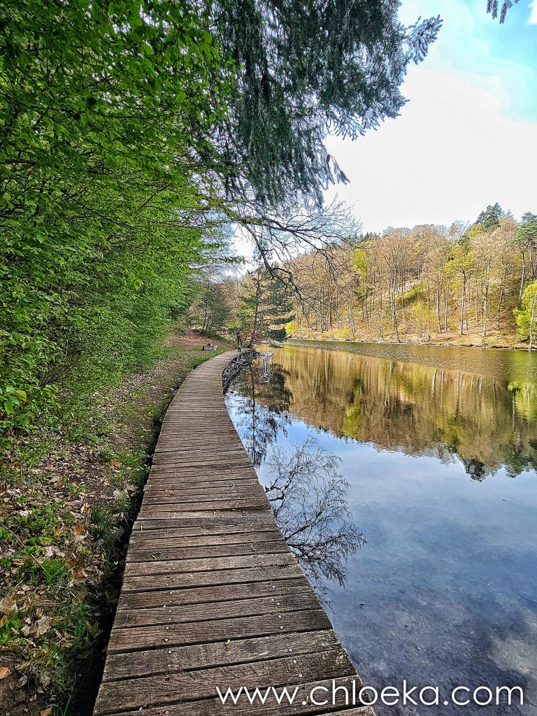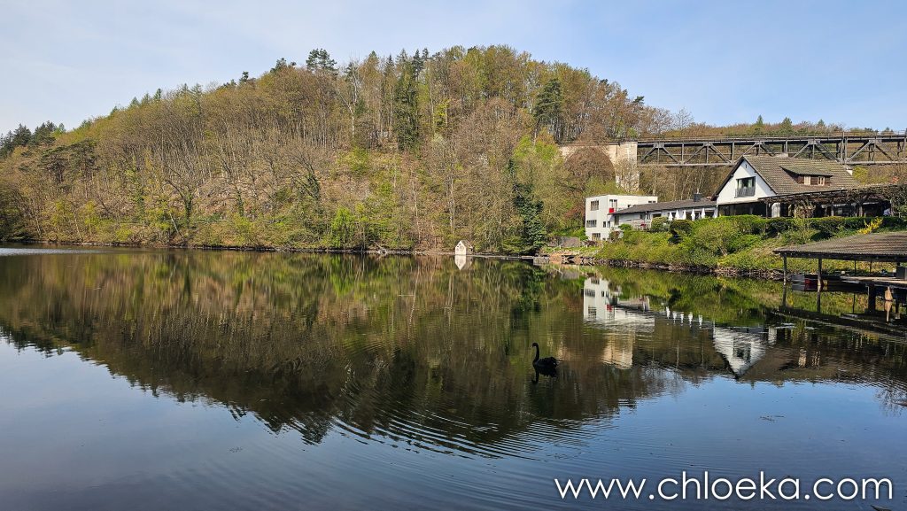 En contrebas, l’eau circule. Le lac d’Eiswoog s’ouvre, c’est un lac artificiel. Il se trouve sur le chemin de pèlerinage de Saint-Jacques-de-Compostelle. Un cygne noir s’y prélasse.