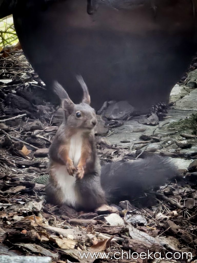 Elle, en revanche, tient le territoire. Entre elle et moi, ça fait déjà beaucoup de présence à tolérer pour des êtres plus discrets. Désormais, elle descend manger tranquillement au pied de l’arbre pendant que je suis installée dans le jardin. Son drey est là, dans les sapins qui bordent la maison.