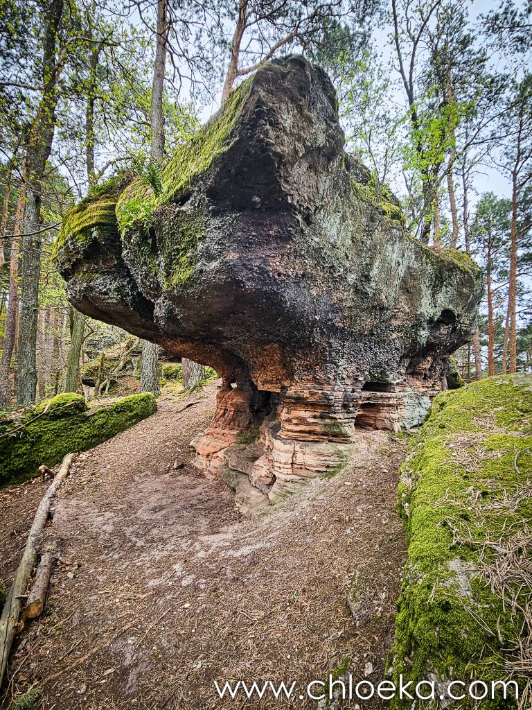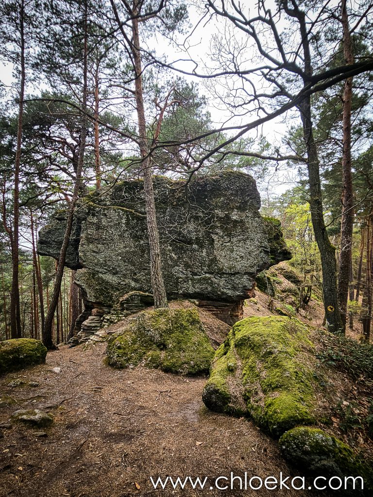 La boucle fait une dizaine de kilomètres, et très vite, le chemin s’enfonce dans les pins du Pfälzerwald. L’air y est sec, résineux, et le sol crisse sous les pas. La journée s’annonce chaude. Par endroits, des roches aux lichens et aux mousses vertes surgissent, comme si la forêt avait laissé affleurer ses os. Nous nous aventurons vers la Teufelsmauer, une muraille rocheuse presque cachée, faite de conglomérats et de grès rouges vieux de millions d’années.  Ensuite, la descente s’amorce vers l’Ungeheuersee. Un plan d’eau sombre, en apparence immobile, écrin aux verts foncés presque noirs dans le creux de la forêt. Les panneaux racontent : peu profond, acide, sans poissons. Ancien lieu de pâturage, puis laissé à lui-même.