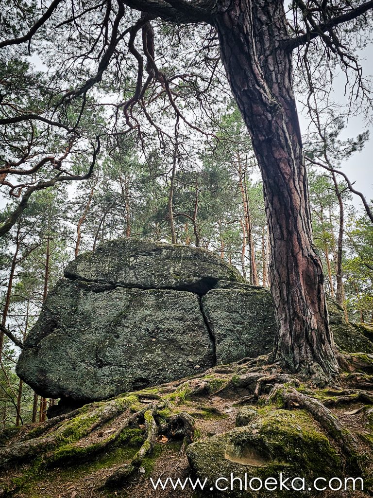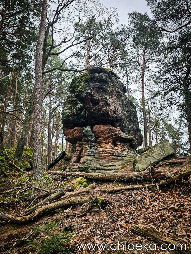 Un des points de passage sont les Kupferfelsen, surnommés le “Kamelkopf”, la tête de chameau. Ils ne s’imposent pas par leur hauteur, mais par leur présence. Des blocs de grès, épais, stratifiés, comme empilés par le temps. Leur base est creusée, leurs flancs marqués de couches horizontales, leurs sommets arrondis et sombres, parfois couverts de mousse et de fougères discrètes.