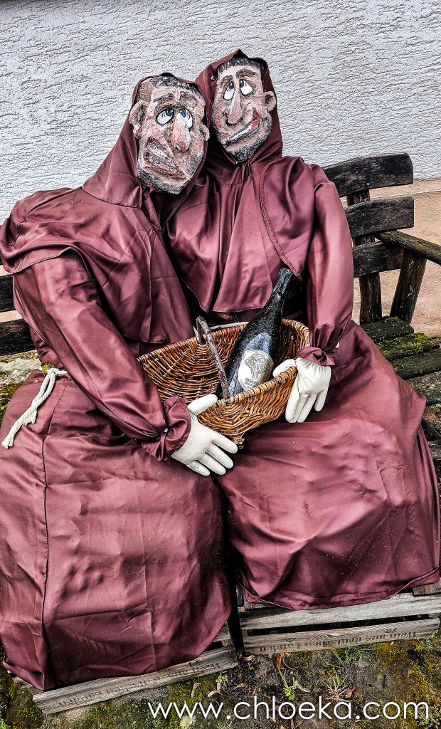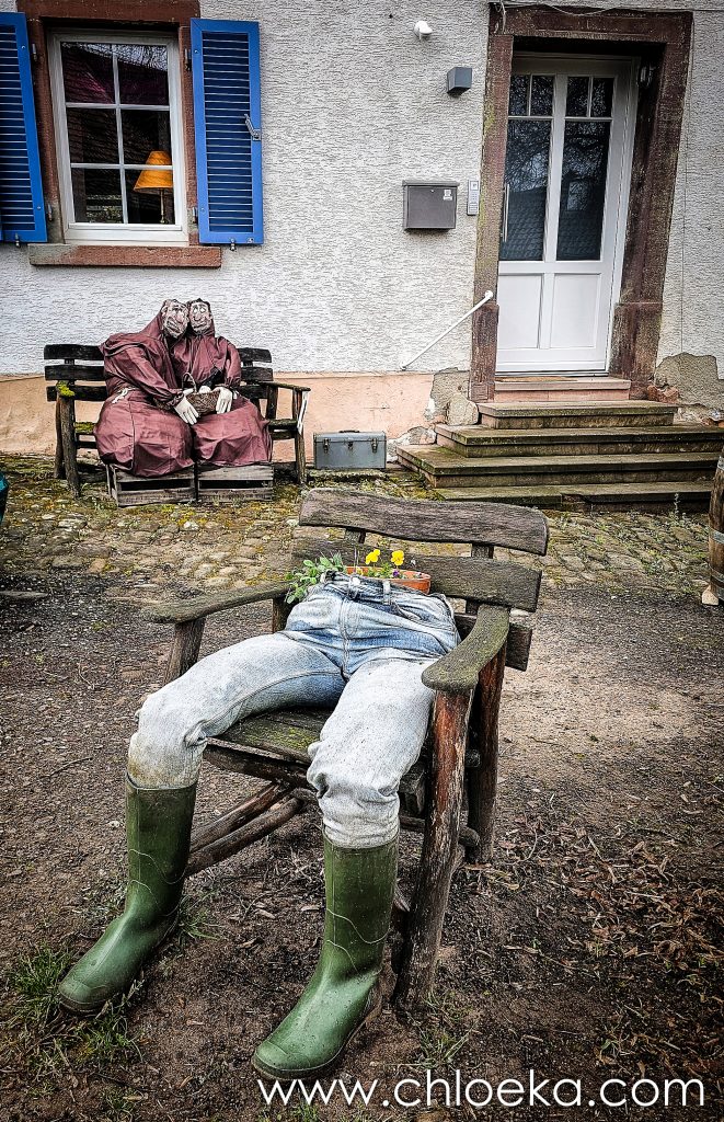 De surprenantes décorations jalonnent les rues. Elles relèvent d’un folklore rural un peu décalé, à la frontière entre humour et étrangeté. Il y a quelque chose de volontairement kitsch et bricolé. L’ensemble crée un contraste assez troublant — entre le familier et le légèrement inquiétant. On pourrait qualifier ça de “fantaisie villageoise” ou de “kitsch champêtre”, avec une touche d’absurde : une manière d’habiter l’espace extérieur en y injectant de la présence, même artificielle, comme pour rompre le vide des rues. On retrouve cette façon d’habiter les cours et jardins partout. Notre gîte en est un exemple parfait.