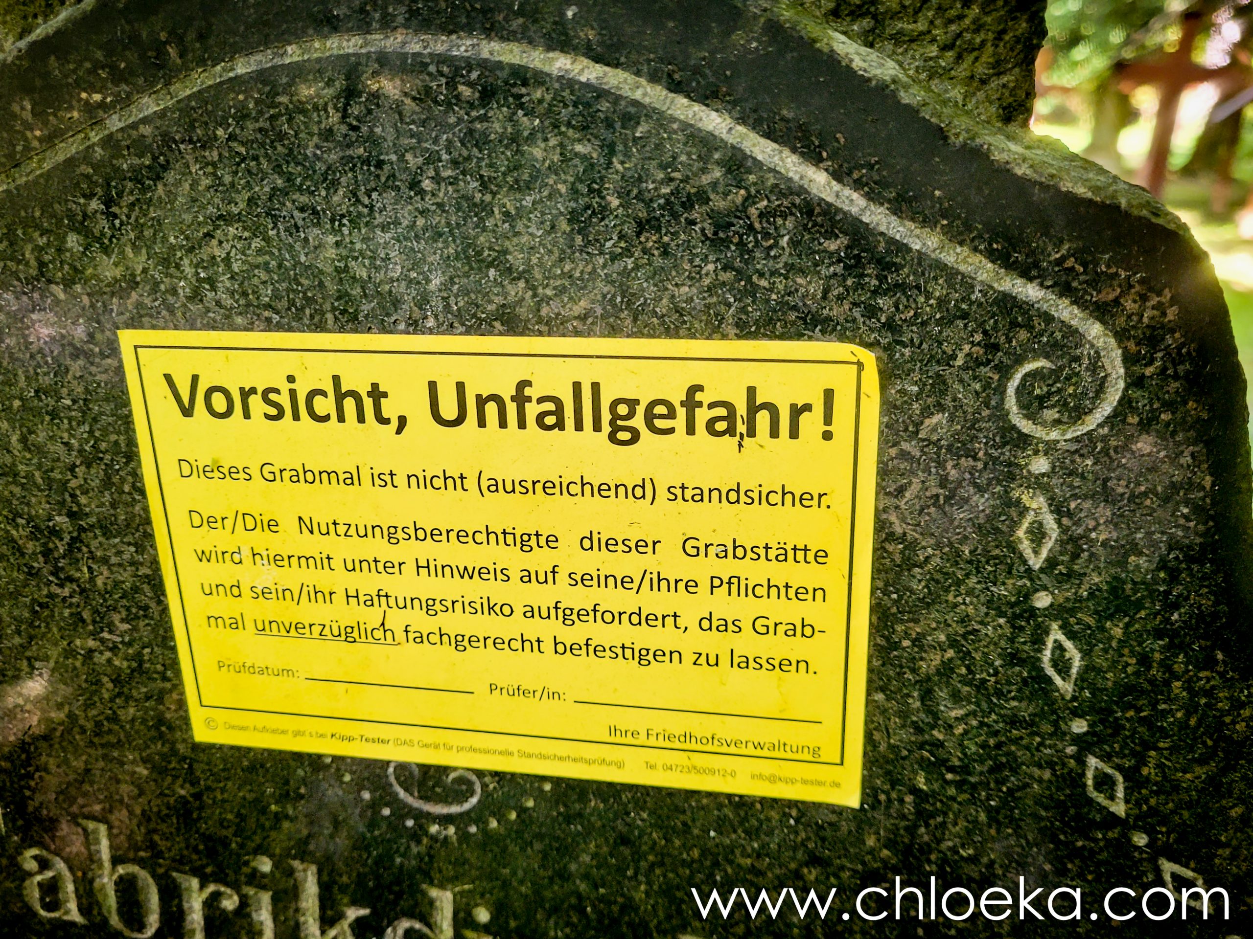 Panneau d’avertissement sur une pierre tombale Texte : « Attention, danger d’accident ! » Cette tombe n’est pas suffisamment stable. Responsabilité : Le ou la titulaire des droits d’usage de cette sépulture est averti(e) de son obligation de sécurisation et des risques juridiques encourus. Action demandée : Faire consolider la tombe sans délai et par un professionnel. Émis par : L’administration du cimetière.